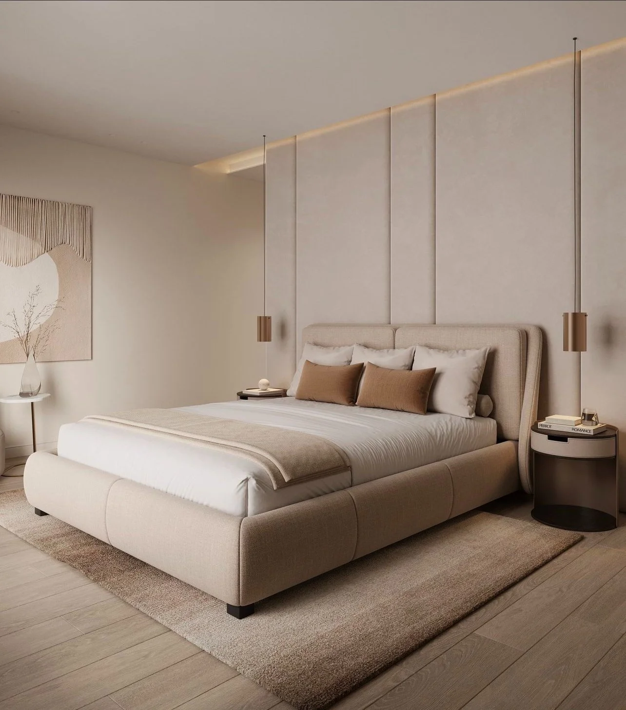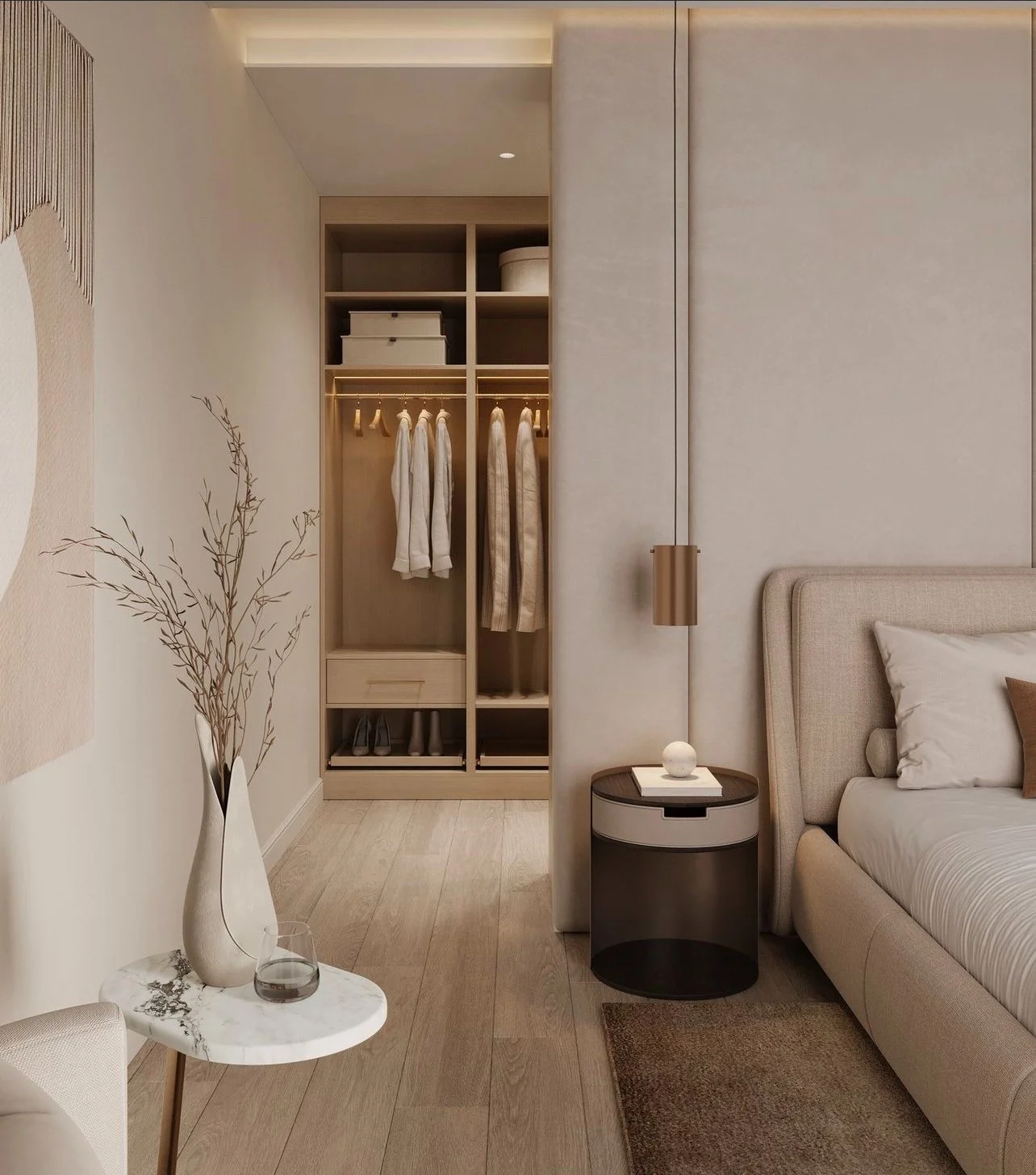 A warm, neutral palette combined with minimal yet refined materials creates a calming atmosphere reminiscent of a luxury hotel suite. Soft textures, carefully curated furnishings, and subtle lighting enhance the sense of tranquility, while the seamless connection to the walk-in closet adds both functionality and flow.